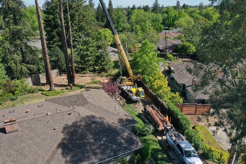 TreeMax is one of our local arborists that we partner with frequently and removed the trees from a Sacramento residence in this project. TreeMax limbed the trees prior to our arrival, creating the bare trunks to remove. This project required a skilled team on both sides. You can see how challenging it was for the arborist to work from the top down. We removed four trees, with the tallest at 110”. Part of the challenge was the homeowner wanted to retain the big wood from the trees to have milled to bring back to the property and build a custom redwood deck.