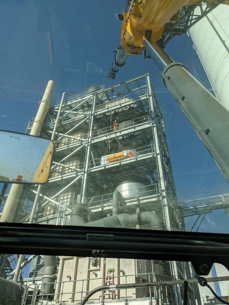 On this project we used a 26 Ton all the way up to a 350 Ton cranes from our fleet. The structure is 108 feet tall. The largest pick on this project was a 98,000-pound radiation heater that had to be hoisted into the structure from the top.